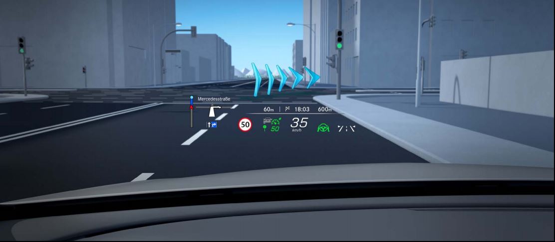 기존의 헤드업 디스플레이보다 확장된 크기로써 실제 도로의 일부인 것 처럼 자연스럽게 보여집니다. 터치 패널에서 네비게이션 또는 운전자 지원 시스템 간에 빠르게 전환이 가능합니다. 센서 주변에 날씨를 고려하여 주변 환경 밝기에 따라서 헤드업 디스플레이 밝기 또한 자동으로 변합니다. 이로써 날씨가 맑거나, 흐릴때도 명확하게 디스플레이의 정보를 볼 수 있습니다.