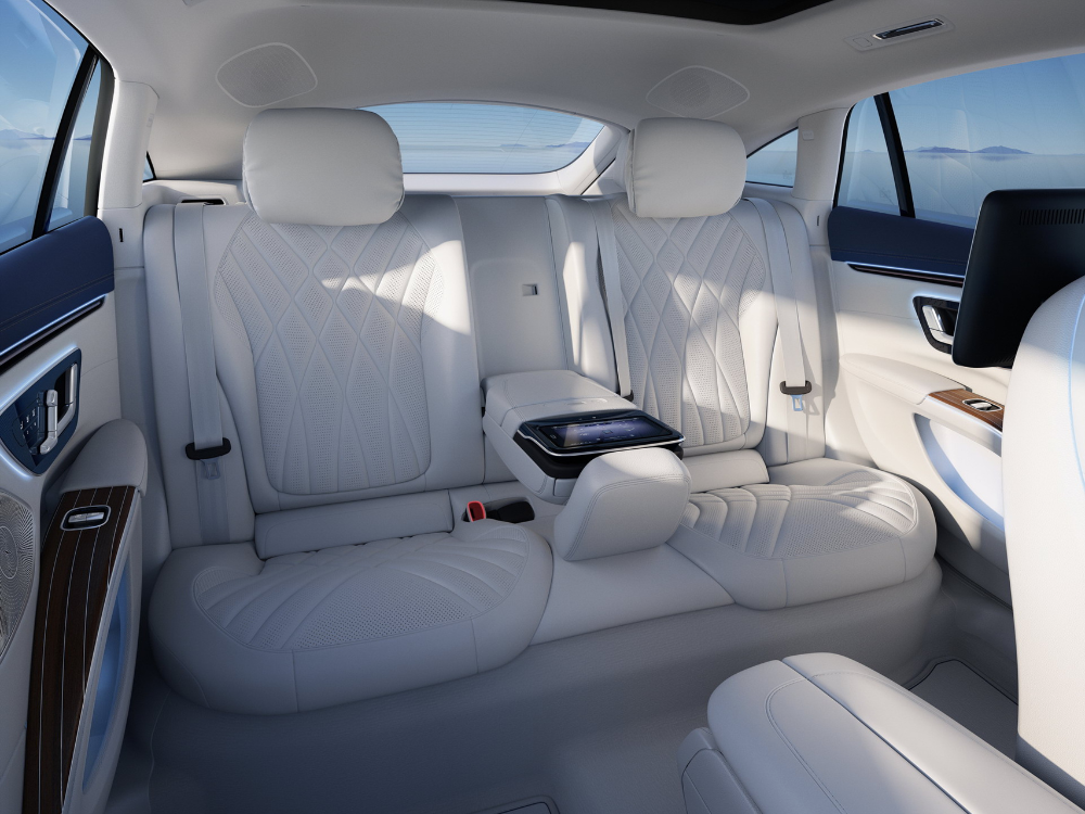 뒷좌석 태블릿으로 멀티미디어 시스템에 엑세스하여 음악 재생 목록을 편집하거나 조명, 온도, 마사지 프로그램 등의 편의기능을 제어할 수 있습니다. 태블릿은 분리하여 차량 외부에서도 사용 가능합니다. 또한 뒷좌석 암레스트에 휴대폰 무선 충전공간이 있습니다.