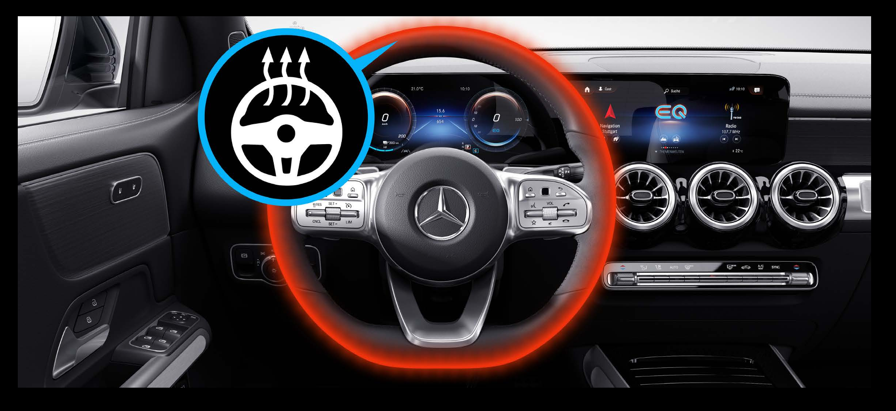 열선이 내장된 스티어링 휠로 손을 따듯하게 해 줍니다. 하지만 Electric Art(기본형 모델)는 기본 사양이고, AMG Line은 적용되지 않는 점 참고하시길 바라겠습니다.