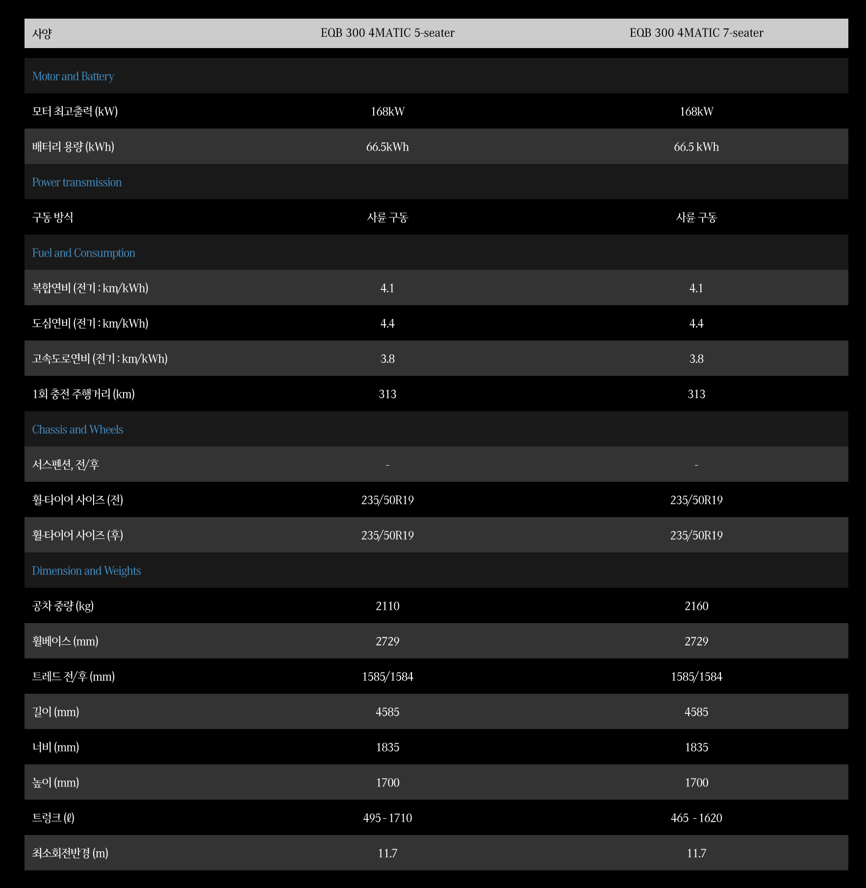 더 뉴 EQB의 재원 및 성능 정보