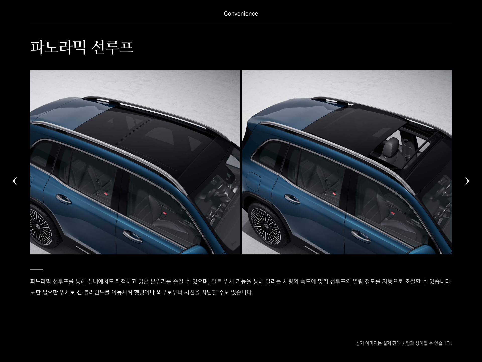 파노라믹 선루프를 통해 실내에서도 맑고 쾌적한 분위기를 느낄 수 있으며, 선루프의 열림 정도를 자동으로 조절 가능합니다. 또한 필요한 위치로 선 블라인드를 이동시켜 햇빛과 외부로부터 시선을 차단할 수 있습니다.