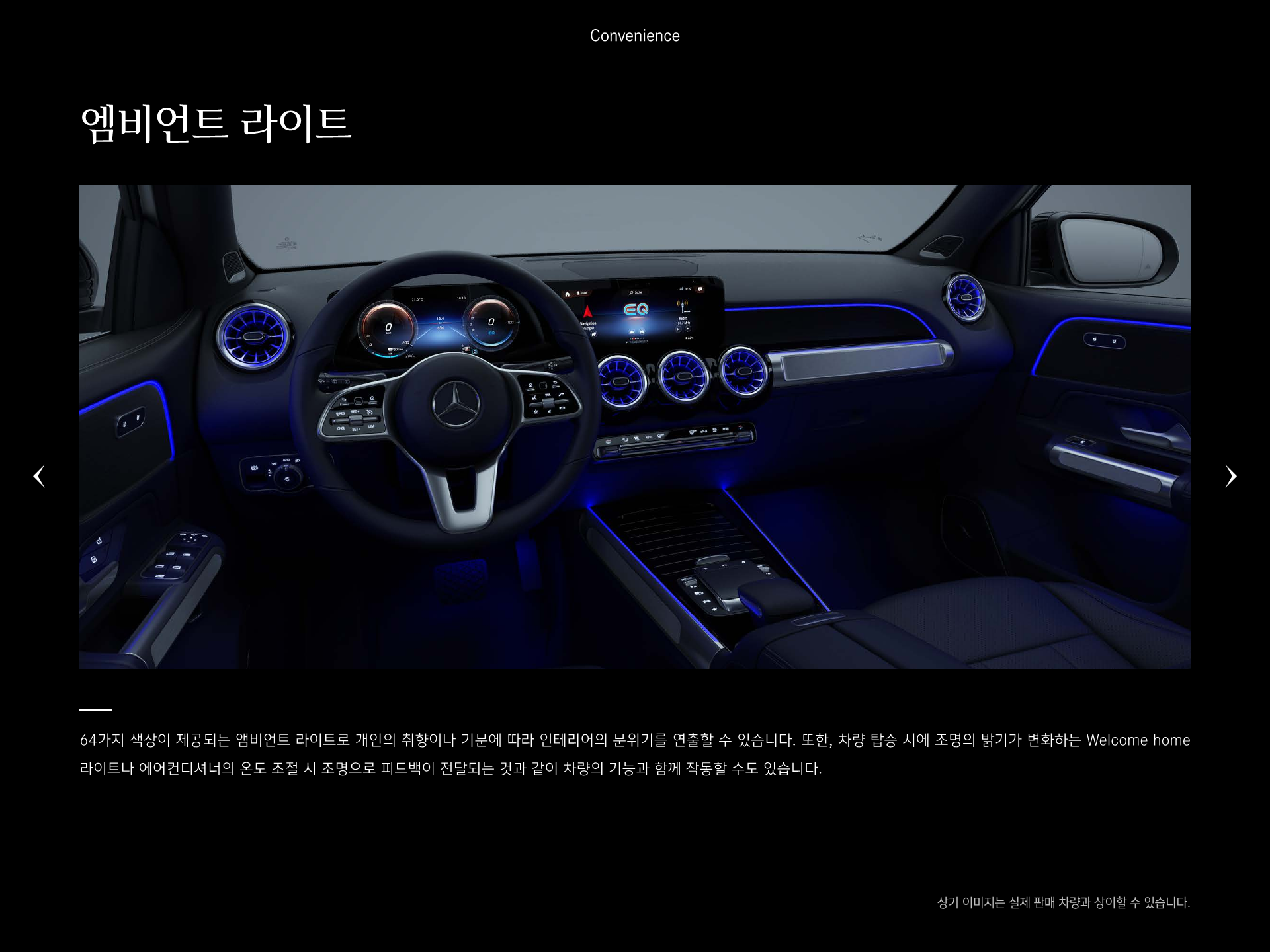 64가지 색상이 제공되는 엠비언트 라이트로 개인의 취향이나 기분에 따라 인테리어의 분위기를 연출 가능합니다.