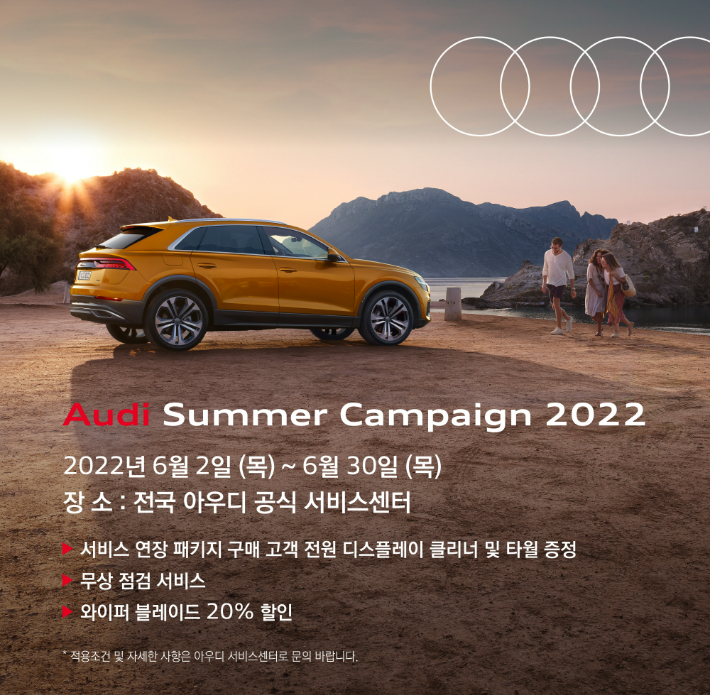 아우디에서 여름철 서비스 캠페인을 진행합니다. 아우디는 6월 2일(목) 부터 6월 30일(목)까지 4주기간 동안 전 차량을 대상으로 '2022년 여름철 서비스 캠페인'을 실시한다고 31일에 발표했습니다. 이번 행사는 전국 40개 아우디 공식 서비스센터에서 동시에 진행됩니다.
